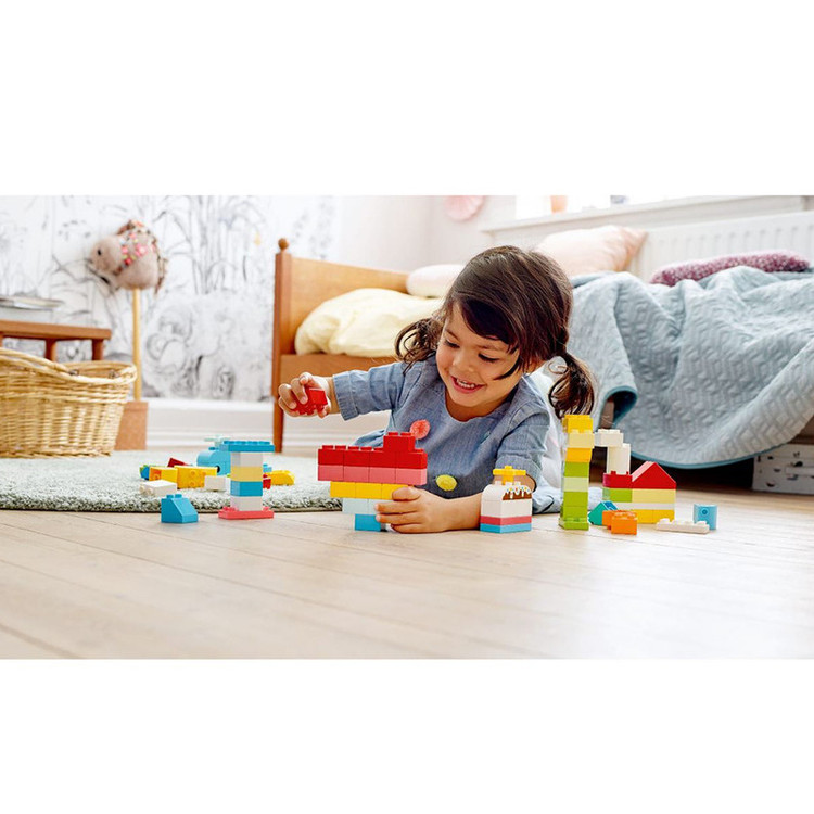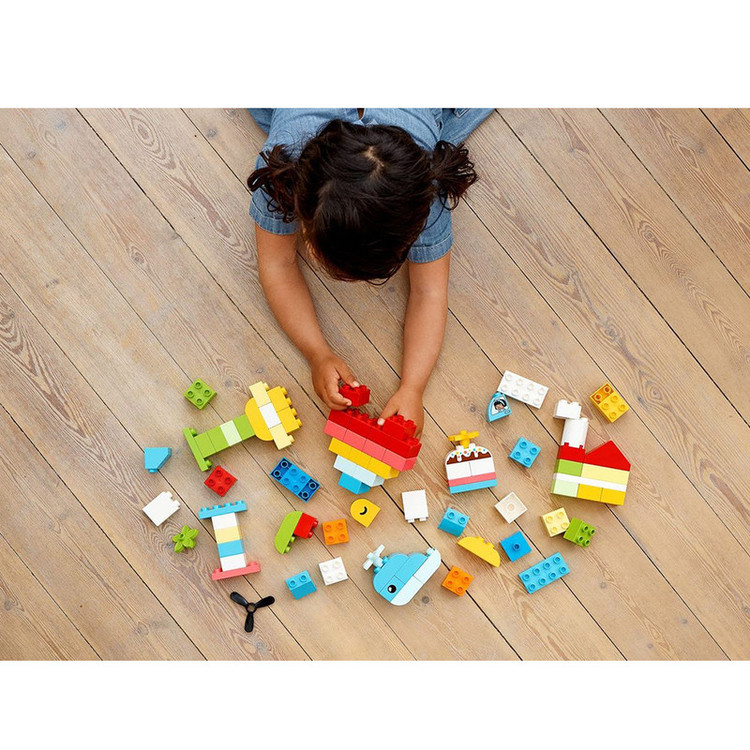 بازی و یادگیری بدون حد و مرز لگو Duplo مدل Classic Heart Box 10909، محصولی متفاوت و جذاب است. این محصول دارای آجرهای متنوع و قطعات ویژه برای هیجان و درگیر کردن ذهن کودکان شما و انجام بازی خلاقانه است. در این محصول مجموعه ای شگفت انگیز از آجرهای لگو در طیف رنگی وسیعی وجود دارد. همچنین موارد زیادی نیز برای داستان سازی جهت ایفای نقش وجود دارد. قطعات مختلف و آسان که تخیل را برانگیخته و فرزند شما را به بازی بدون حد و مرز تشویق می کند، باعث خلاقیت هرچه بیشتر کودکان نوپا میشود. لگو Classic Heart Box شامل موارد زیر می باشد: خانه بستنی نهنگ گل هلیکوپتر اردک 80 قطعه دفترچه راهنما دارای ایده هایی برای ساخت 15 مدل اولیه بازی با لگو Duplo لذت بخش است و قوه تخیل و همذات پنداری را در فرزندان تقویت می کند و با نقش آفرینی و بازی های خلاقانه لحظات خوشی را برایشان فراهم میکند . شما می توانید با اضافه کردن مجموعه های دیگر، لگو های خود را در کنار این ست دوست داشتنی بچینید و از آن لذت ببرید. لگو Duplo مدل Classic Heart Box 10909 محصولی بی خطر برای کودکان لگو دوپلو مدل Classic Heart Box مناسب برای کودکان 1 سال و نیم به بالاست به همین دلیل مهم است که قطعات به سادگی داخل هم چفت شده و از هم جدا شوند و از نظر ابعاد به گونه ای است که اگر فرزند شما آجر های لگو را در دهان خود بگذارد، قابل بلعیدن نیستند. کودک شما به کمک این محصول می تواند علاوه بر بازی و سرگرمی، مشغول به یادگیری شود. ابعاد و ویژگی های دیگر لگو Duplo مدل Classic Heart Box 10909 بلاک 2X2 لگو دارای 3سانتیمتر ارتفاع، 3سانتیمتر طول و3 سانتیمتر عرض است. این محصول مطابق با بالاترین استانداردهای بین المللی ساخته شده است. فاقد مواد سمی و مضر برای کودکان میباشد. مجموعه های ساختنی LEGO استانداردهای روز جهانی را رعایت میکنند تا اطمینان حاصل شود که آنها با باقی قطعات سازگار هستند و هر بار به طور کامل به هم متصل و از هم جدا میشوند. روی تمامی قطعات لگو آزمایشهای دقیقی مانند تست مقاومت در برابر حرارت و فشار انجام می شود تا از کیفیت آنها مطمئن شوند.